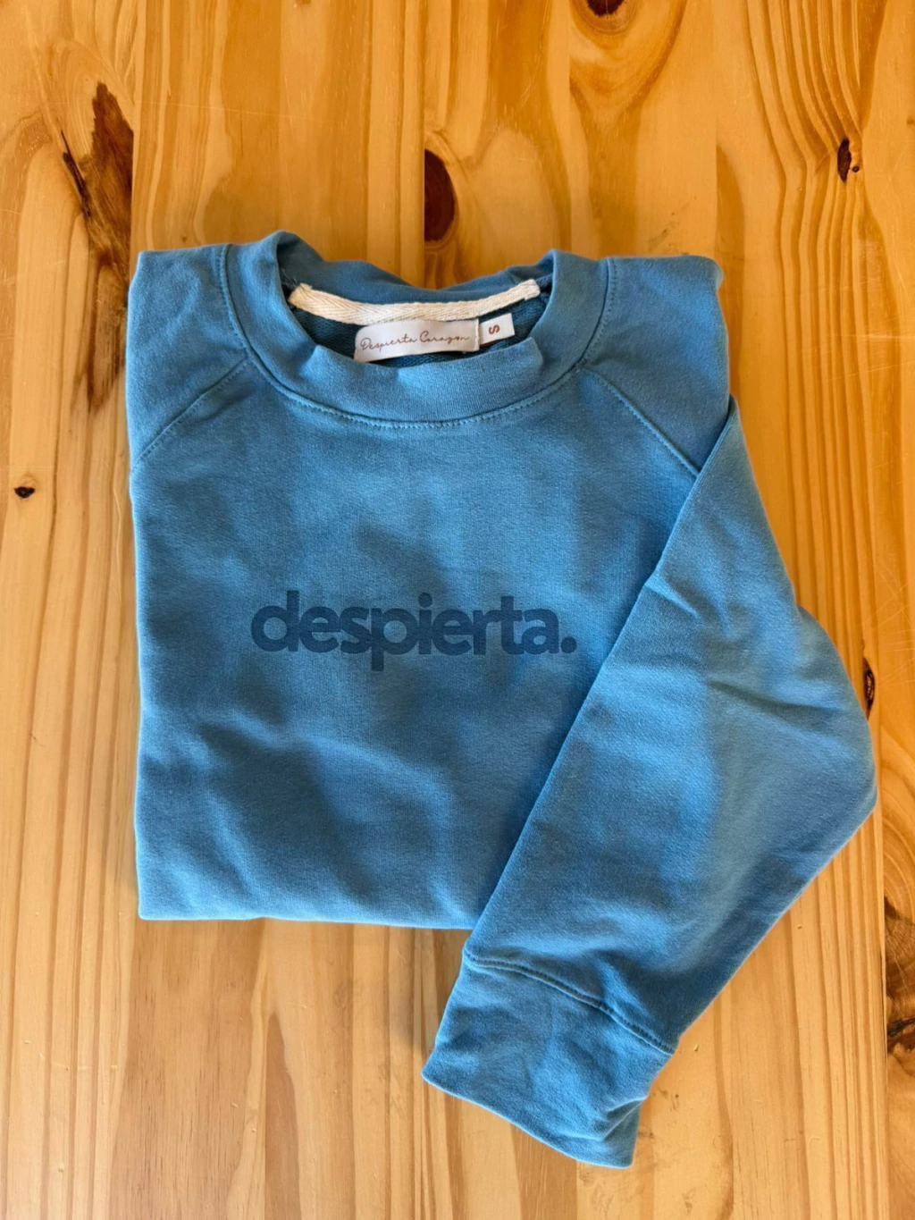 Buzo de algodón rústico súper soft premium, color turquesa, con el mantra “DESPIERTA" estampado al frente.