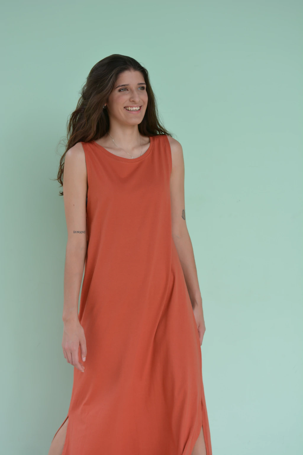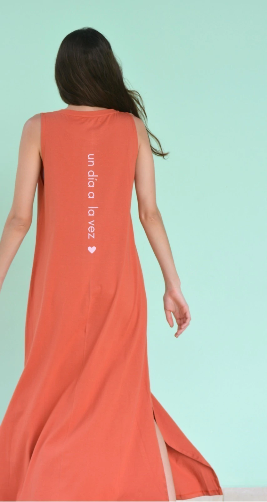 Vestido largo de algodón, sin mangas, de sisa amplia.